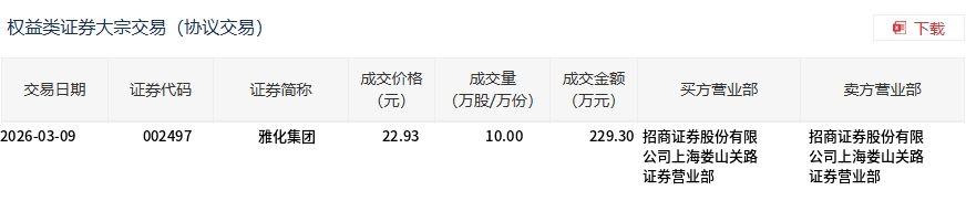 3月9日,雅化集团大宗交易成交10万股,成交额229.3万元,占当日总成交额的0.22%,成交价22.93元,较市场收盘价24.13元折价4.97%。