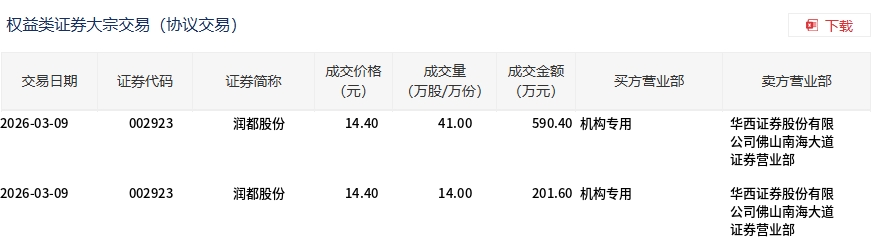 3月9日,润都股份大宗交易成交55万股,成交额792万元,占当日总成交额的5.08%,成交价14.4元,较市场收盘价15.79元折价8.8%。
