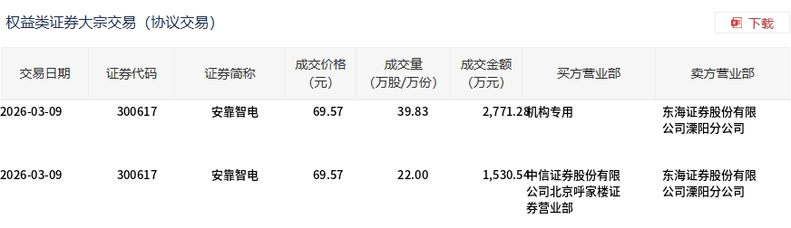 3月9日,安靠智电大宗交易成交61.83万股,成交额4301.82万元,占当日总成交额的1.8%,成交价69.57元,较市场收盘价70.85元折价1.81%。