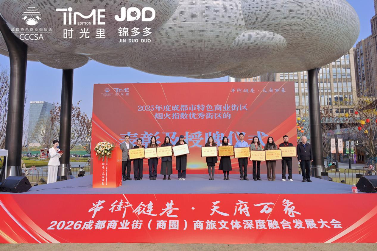 大会现场发布了2025年度“烟火指数优秀街区”榜单。作为成都特色商业街年度“大考”的权威发布,榜单涵盖“最具烟火气特色商业街区TOP10”“最具特色烟火商业街区TOP10”“最具夜间烟火味特色商业街区TOP10”三大类别,春熙路、宽窄巷子、东郊记忆、交子大道(含双塔双集)、华熙LIVE·528、优品天地、壹方里、铁像寺水街等30个特色商业街区上榜。这些街区以鲜明的特色、旺盛的人气和持续的创新,生动诠释了成都街巷的万千气象与烟火魅力,成为展示成都公园城市示范区与国际消费中心城市建设成果的亮丽窗口。