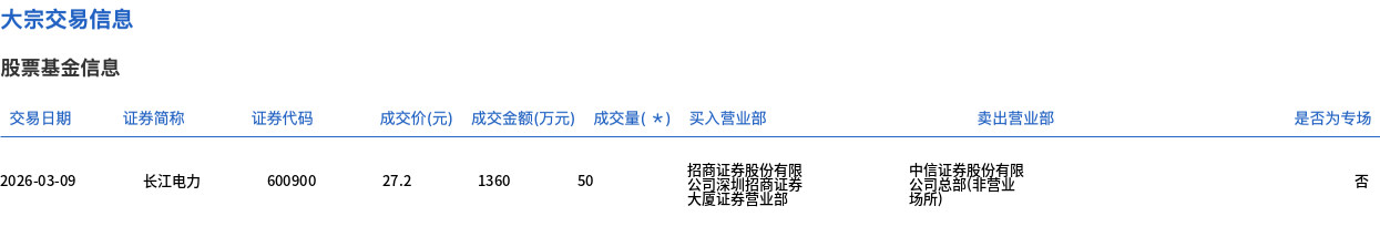 3月9日,长江电力大宗交易成交50万股,成交额1360万元,占当日总成交额的0.24%,成交价27.2元,较市场收盘价27.2元持平。