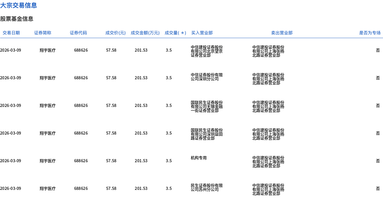 3月9日,翔宇医疗大宗交易成交21万股,成交额1209.18万元,占当日总成交额的6.23%,成交价57.58元,较市场收盘价64.41元折价10.6%。