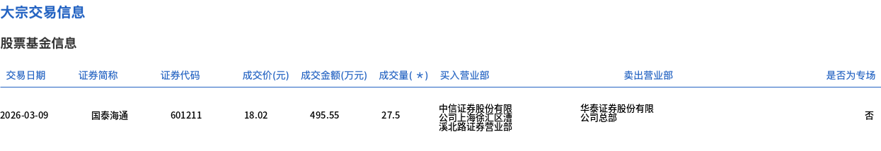 3月9日,国泰海通大宗交易成交27.5万股,成交额495.55万元,占当日总成交额的0.3%,成交价18.02元,较市场收盘价18.02元持平。