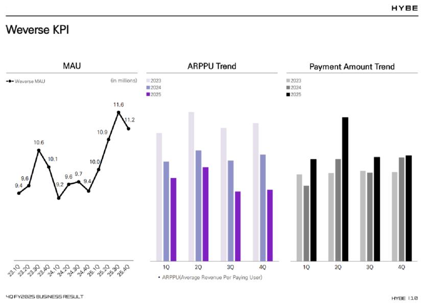 在财务说明会上,HYBE举例了海外IP孵化的成绩,特别强调咯额北美女子组合CA(Cathedral)的成功,通过将HYBE成熟的粉丝运营、内容制作和IP商业化经验进行本土化适配,最终实现了巡演票房与周边销量的爆发式增长。在这一转型中,粉丝平台Weverse扮演了关键的角色。