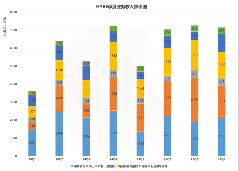 接下来看HYBE。如果说SM表现得像是一个“偶像IP商业化工厂”,那么HYBE财报则显示,HYBE的战略重心正在发生转移,其正试图将公司自身打造为一个“偶像IP孵化平台”,而从而减少对少数顶级艺人周期性活动的依赖程度。