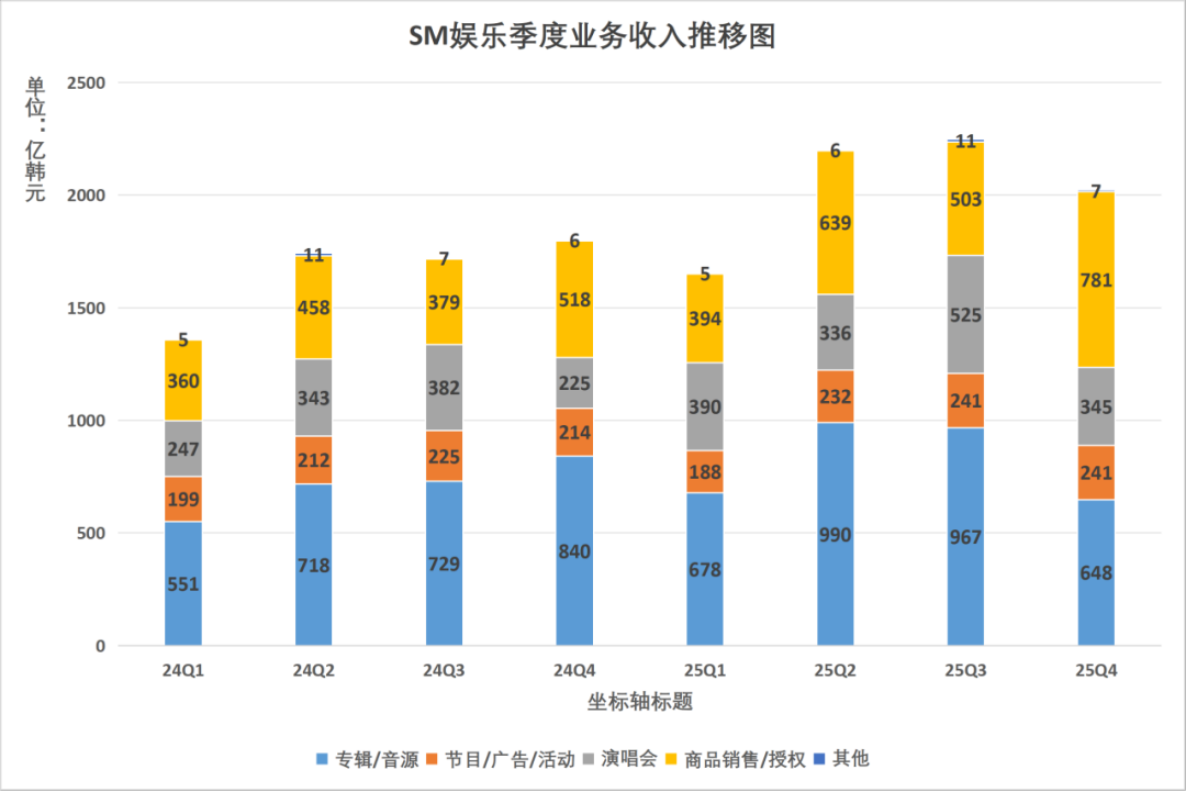 经雷报计算,2025年全年,SM【商品销售及授权】业务总收入2317亿韩元(约合人民币11.3亿元),同比大幅增长35%。