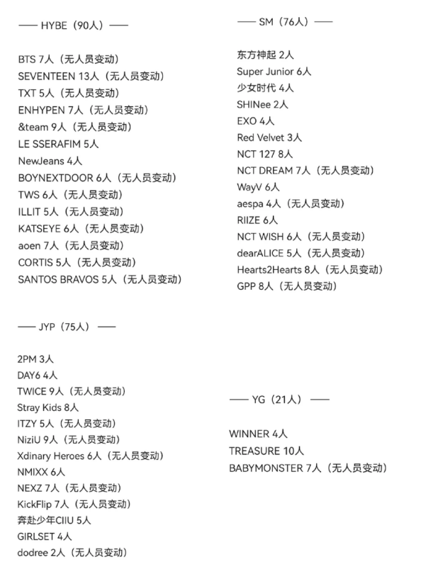 HYBE、SM、JYP、YG现役在团艺人数量(网友整理)