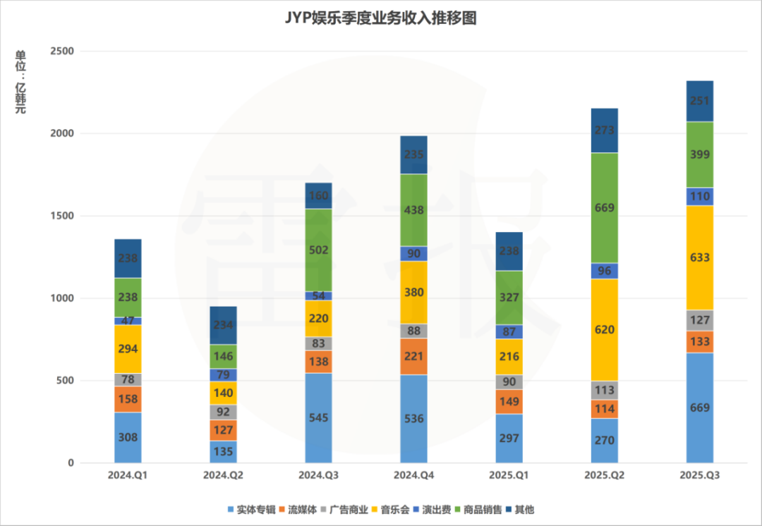 有趣的是,经雷报计算,2025年前三个季度JYP娱乐商品销售收入总计1395亿韩元(约合人民币6.84亿元),比上一年同期增长57.4%。