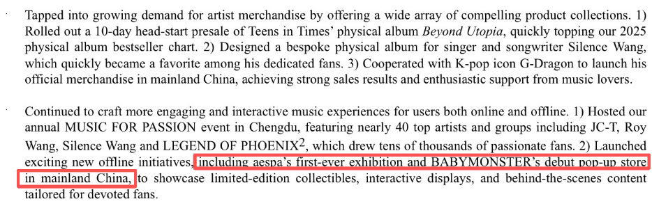 例如,2025年11月底,BABYMONSTER在中国大陆的首个快闪店在广州天河领展广场开幕。这场快闪的官方预约通道直接嵌入了QQ音乐APP,粉丝需要“打开QQ音乐-搜索 BABYMONSTER”才能完成预约。此外,在腾讯音乐2025年公布的财报中,也明确将“BABYMONSTER中国大陆首个快闪店”列为平台打造的线下沉浸式体验之一。