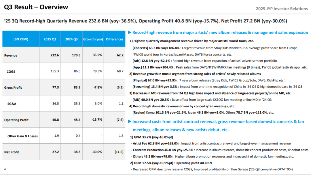2025年Q3,JYP娱乐营收创下历史新高,但与之形成反差的是营业利润和净利润的同比下滑。下滑主要源于头部艺人续约、新人团体出道、全球业务扩张所带来的显著成本压力。