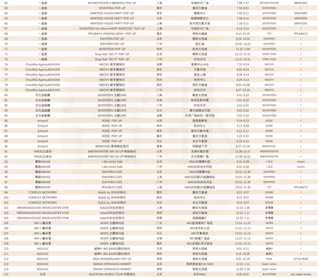 快闪店是官方目前最看重、也最见效的线下生意。2025年,全国各大城市的商场里举办了超过113场KPOP主题快闪。店里布满偶像的大幅海报和立牌,售卖限定周边,让粉丝能沉浸式地体验“靠近”偶像的感觉,也心甘情愿地为这份体验付费。