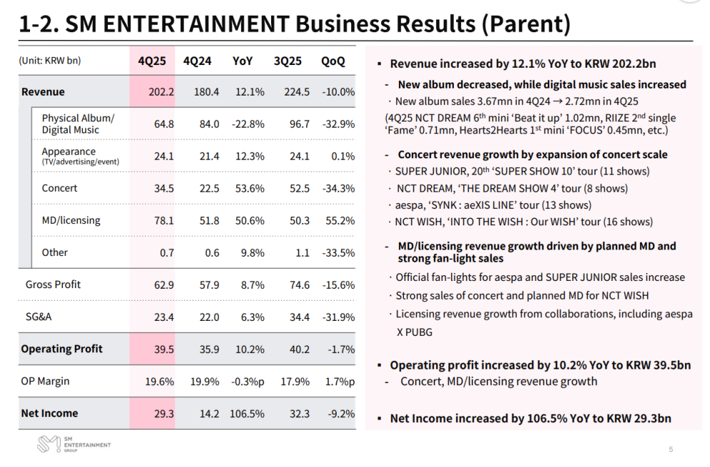SM在KPOP偶像IP的体系化开发和商业化上最为突出。2025年Q4财报显示,SM【商品销售及授权】业务收入同比激增50.6%达到7810韩元,创下新高,更凸显了其IP商业化的强劲势头与增长潜力。