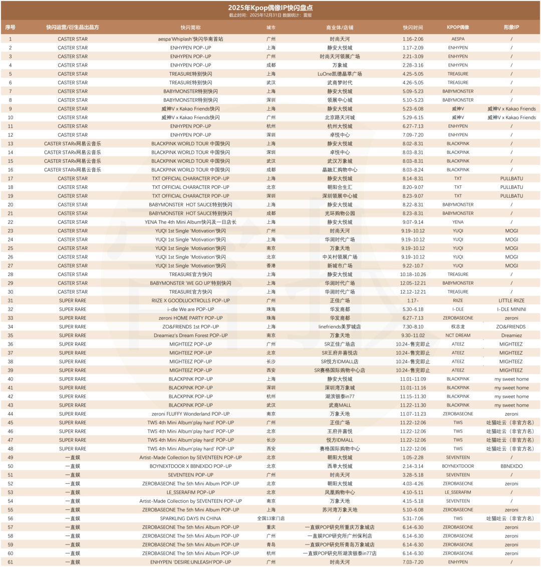 例如,CASTER STAR、一直娱、SUPER RARE是2025年主办快闪场次最多的几家。一直娱通过其线上APP和线下“POP研究所”门店,构建了从购买到体验的闭环,在专辑和周边供应上很有优势;SUPER RARE则是LINE FRIENDS的战略伙伴,擅长运营像BT21、TRUZ这类由KPOP偶像和LINE FRIENDS共同创作的卡通IP。此外,像M2UCAC、次元波板糖等垂直领域玩家也非常活跃。甚至像潮流零售集合店KKV,也会通过与品牌合作的方式介入,探索“KPOP偶像IP+零售”的新玩法(详见:年内快闪113起,KPOP偶像IP在华商业化加速狂飙?| 雷报)。
