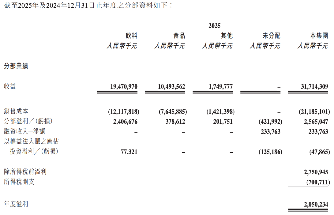(统一饮料和食品的业绩情况,2025年财报)