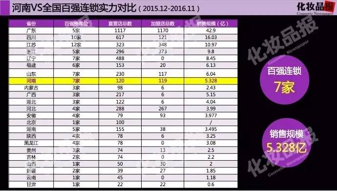 这是一份2016年12月《化妆品报》评选2016中国百强化妆品连锁时收集到的一份数据,这里的化妆品连锁统计维度在2015年12月-2016年11月。就全国34个省自治区对比来看,河南百强连锁实力较强,但是依然有较大的提升空间。