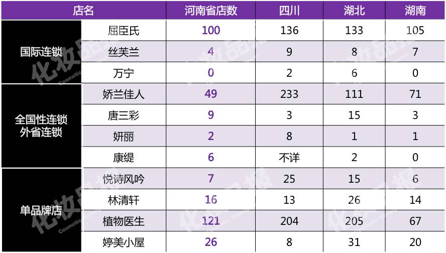 通过这些连锁的官网显示,屈臣氏在河南仅有近100家店,四川有136家,湖北有133家;娇兰佳人官网显示,在河南仅有49家,四川有233家,湖北有111家,湖南有71家。