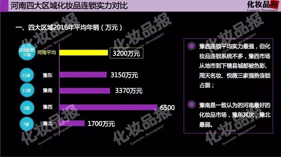 通过这四大区域连锁的三个经营数据比较,我们发现,豫西连锁平均实力最强,豫西三家连锁的平均年销高达6500万元,豫西市场从地市到下辖县城都被色彩、周天名妆、悦薇三家强势连锁占据,但如图所示,化妆品连锁系统不多,因此从连锁系统数量以及连锁平均规模来看,豫南是一致认为的河南最好的化妆品市场,豫东其次,豫北最弱。