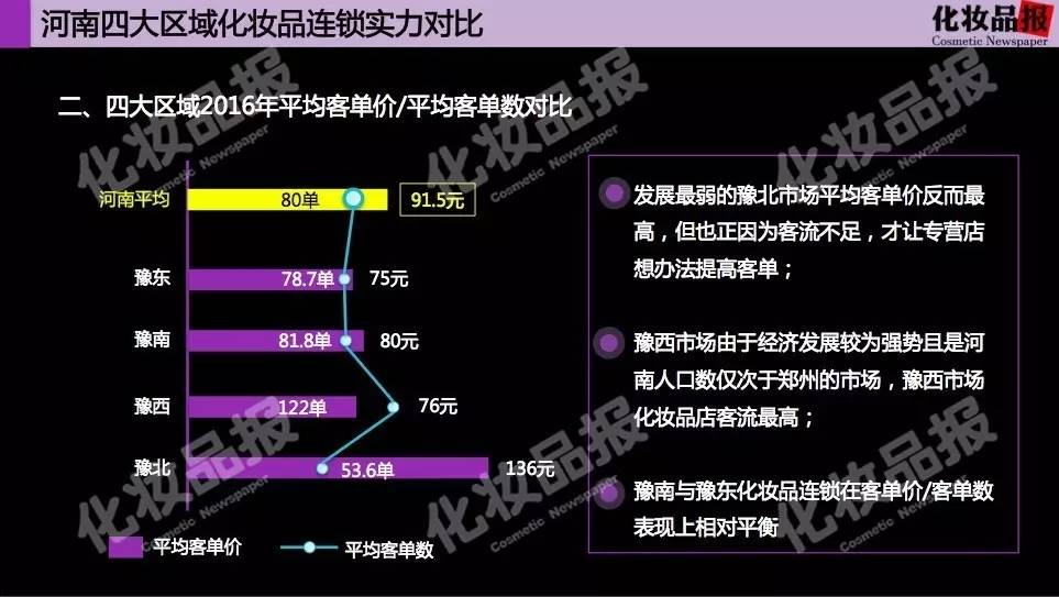 同时,发展最弱的豫北市场平均客单价反而最高达136元,但也正因为客流不足,才让专营店想办法提高客单;豫西市场以洛阳、三门峡为主,由于经济发展较为强势且是河南人口数仅次于郑州的市场,豫西市场化妆品店客流最高;豫南与豫东化妆品连锁在客单价/客单数表现上相对平衡。