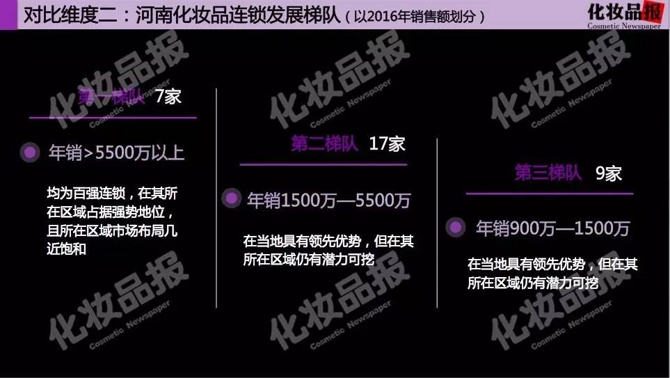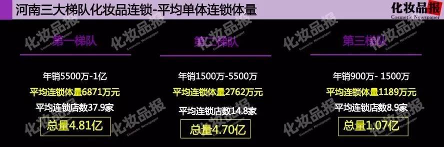 2、第一梯队连锁系统这一比例达16.8%,意味着第一梯队连锁系统正在试图以超于河南化妆品店平均发展速度快速发展;