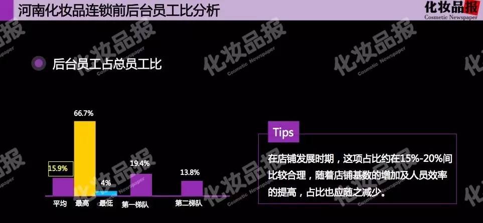 1、河南33家化妆品连锁系统后台人数占总员工数达15.9%,河南专营店渠道整体处于发展期;