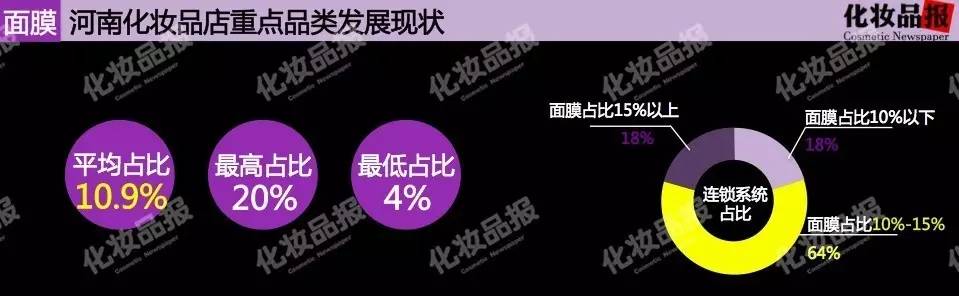 而面膜品类在河南33家化妆品连锁中平均占比达10.9%,最高占比达20%,最低仅为4%,65%连锁面膜占比达到了10%-15%。