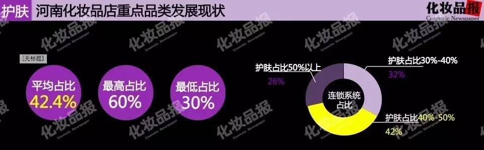 《报告》显示,目前护肤仍占主导,平均占比达42.4%,但份额渐被彩妆与面膜稀释;彩妆销售占比偏低的门店,护肤占比一般偏高;护肤占比仅为30%的门店,面膜占比普遍达10%以上,彩妆销售占比普遍达20%以上,且据我们走访市场了解,这类门店品类结构,是河南化妆品店较为理想的品类结构。