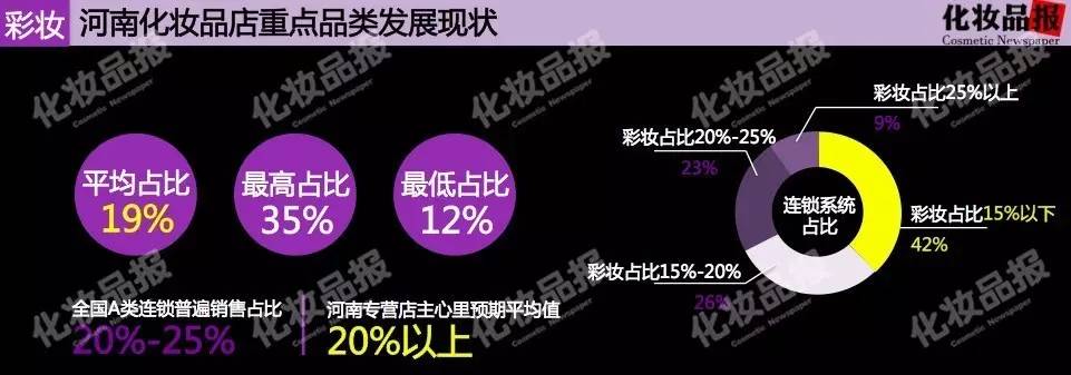 在河南33家化妆品连锁中,彩妆平均占比高达19%,最高销售占比达35%,最低仅为12%,但全国A类连锁普遍销售占比在20%-25%。也就是说,河南专营店里彩妆销售情况低于全国平均水平。