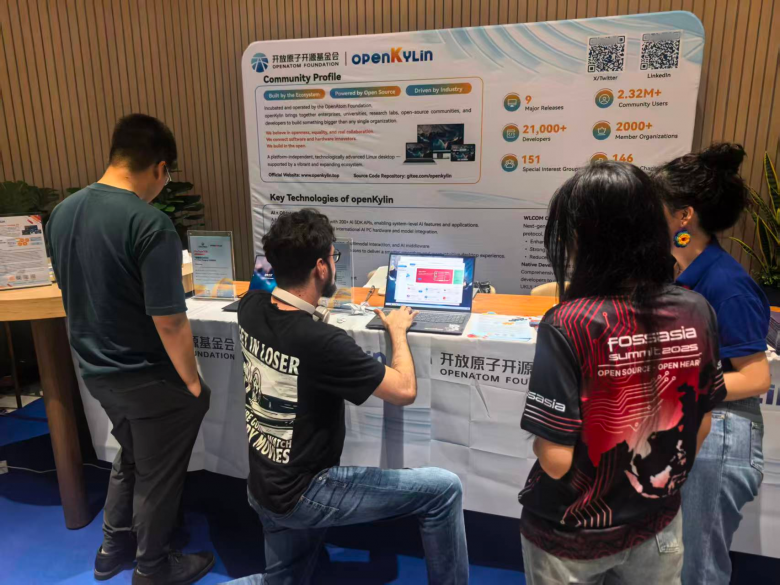 此外,峰会同期设置的openKylin联合展台成为会场人流较为密集的区域之一,展示了社区与麒麟软件、海光、飞腾、涛略、进迭时空等伙伴在AI应用、桌面环境及RISC-V适配等方面的实践成果。多位国际开发者就社区贡献机制、硬件适配流程等问题与openKylin核心贡献者进行了交流。