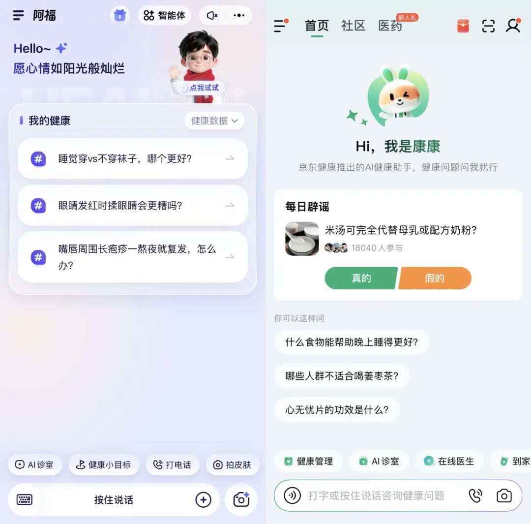 2024年7月,京东健康推出AI智能体“康康”,提供线上问诊、到家检测、外卖买药等服务;2025年6月,蚂蚁集团上线“蚂蚁AQ”,后改名“蚂蚁阿福”;同年7月,字节跳动上线“小荷AI医生”;10月,百度健康推出AI管家,后升级为“文心健康管家”。