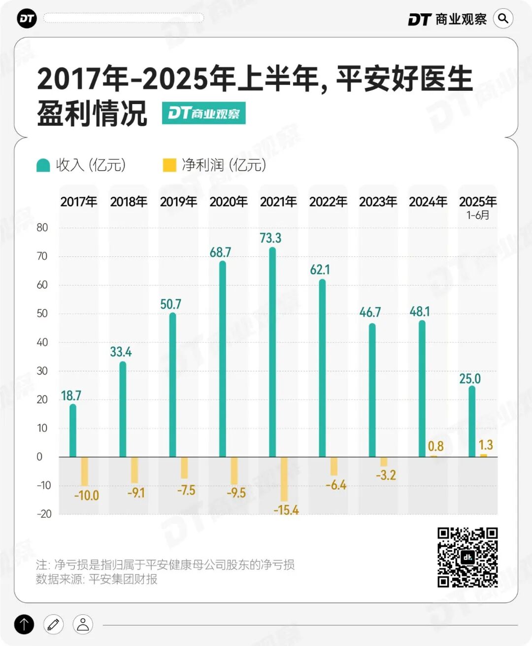 平安好医生则另辟蹊径。它依托平安集团的保险生态,将健康服务打包卖给保险客户,但这一模式前期投入巨大,回报周期长,2017年-2023年,平安健康连续7年亏损超61亿,直到2024年扭亏为盈。