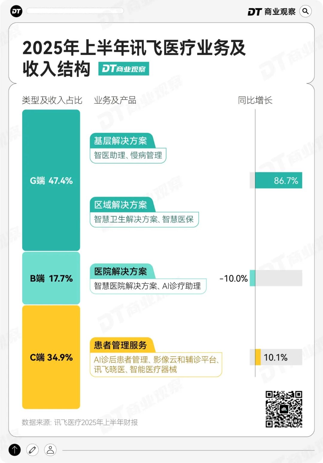 在这条赛道上,讯飞医疗作为早布局者,G 端业务已成为其规模化收入的重要来源。2025年上半年,讯飞医疗G端业务收入占比47.4%,同比增长86.7%,远超C端10.1%的增速和B端-10%的下滑态势。