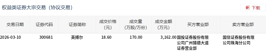 3月10日,英搏尔大宗交易成交170万股,成交额3162万元,占当日总成交额的21.51%,成交价18.6元,较市场收盘价23.63元折价21.29%。