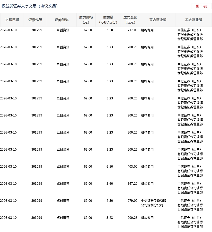 3月10日,卓创资讯大宗交易成交45.94万股,成交额2848.28万元,占当日总成交额的20.98%,成交价62元,较市场收盘价67.25元折价7.81%。
