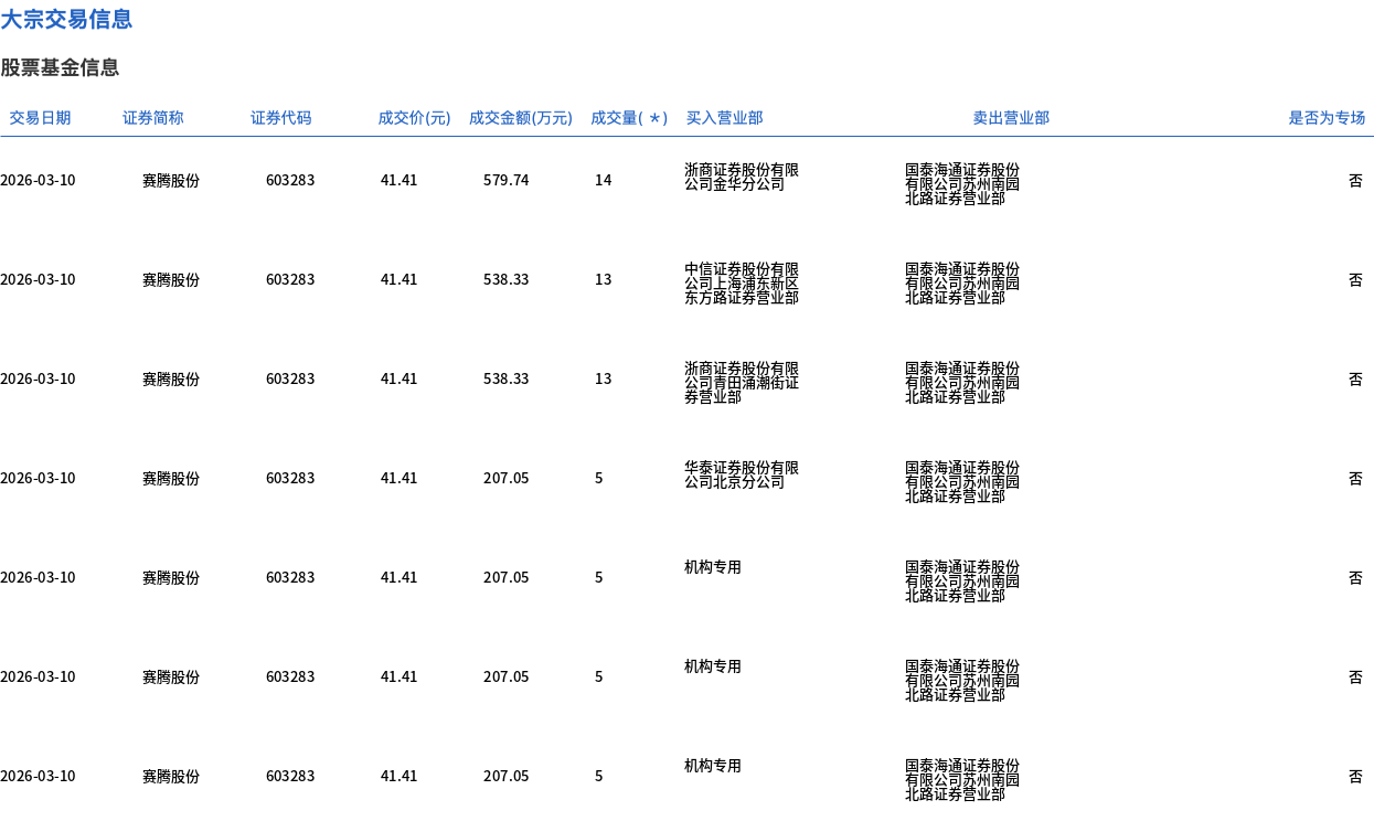 3月10日,赛腾股份大宗交易成交60万股,成交额2484.6万元,占当日总成交额的4.06%,成交价41.41元,较市场收盘价46.71元折价11.35%。