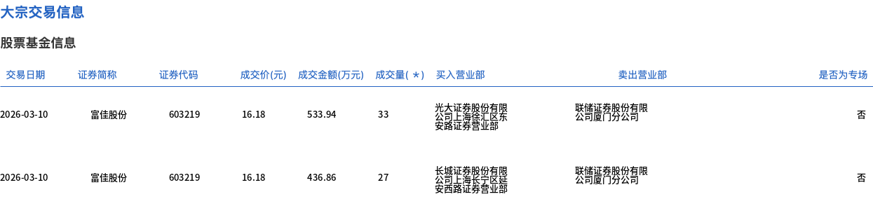 3月10日,富佳股份大宗交易成交60万股,成交额970.8万元,占当日总成交额的7.27%,成交价16.18元,较市场收盘价17.59元折价8.02%。