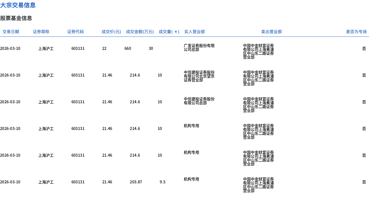 3月10日,上海沪工大宗交易成交79.5万股,成交额1722.27万元,占当日总成交额的6.79%,成交均价21.66元,较市场收盘价24.21元折价10.52%,其中最高成交价22元,最低成交价21.46元。