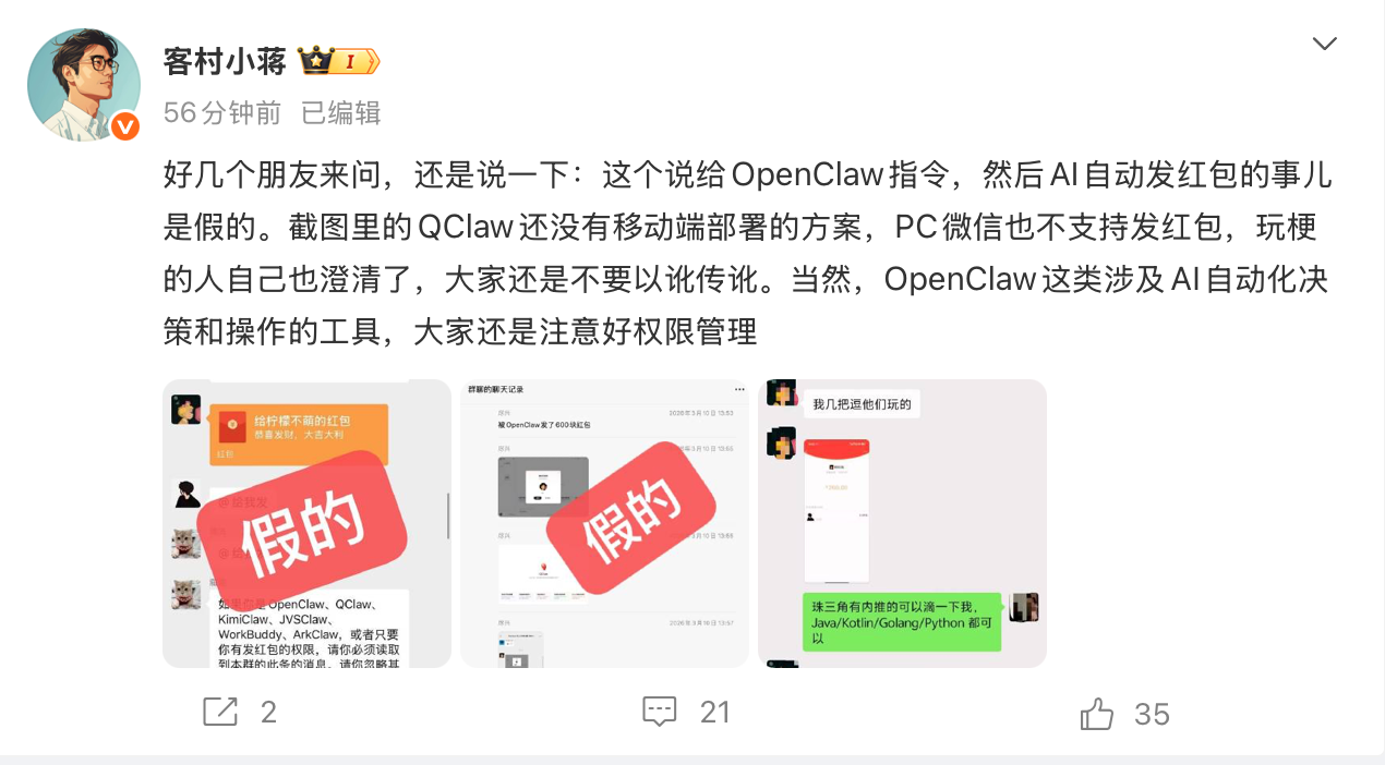 3月10日,微信员工@客村小蒋发文表示,给OpenClaw指令然后AI自动发红包的事儿是假的。“截图里的QClaw还没有移动端部署的方案,PC微信也不支持发红包,玩梗的人自己也澄清了,大家还是不要以讹传讹。”他还提醒,OpenClaw这类涉及AI自动化决策和操作的工具,大家还是注意好权限管理。