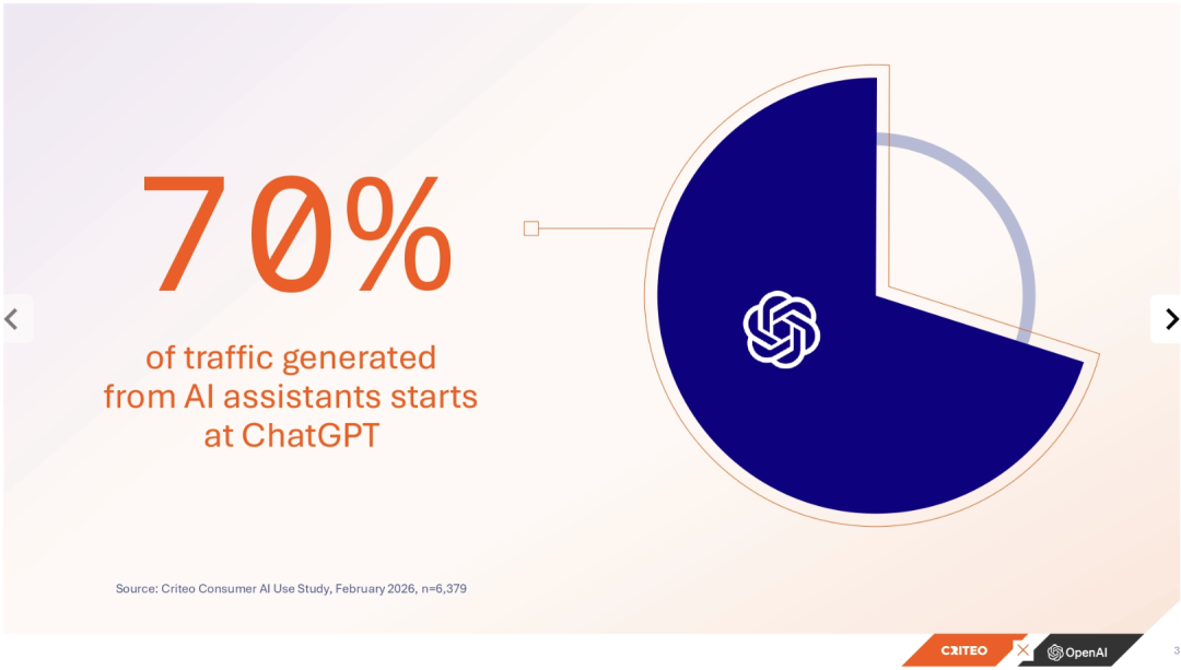 资料中写到,人工智能助手带来的流量里,有70%只从 ChatGPT 发起的。