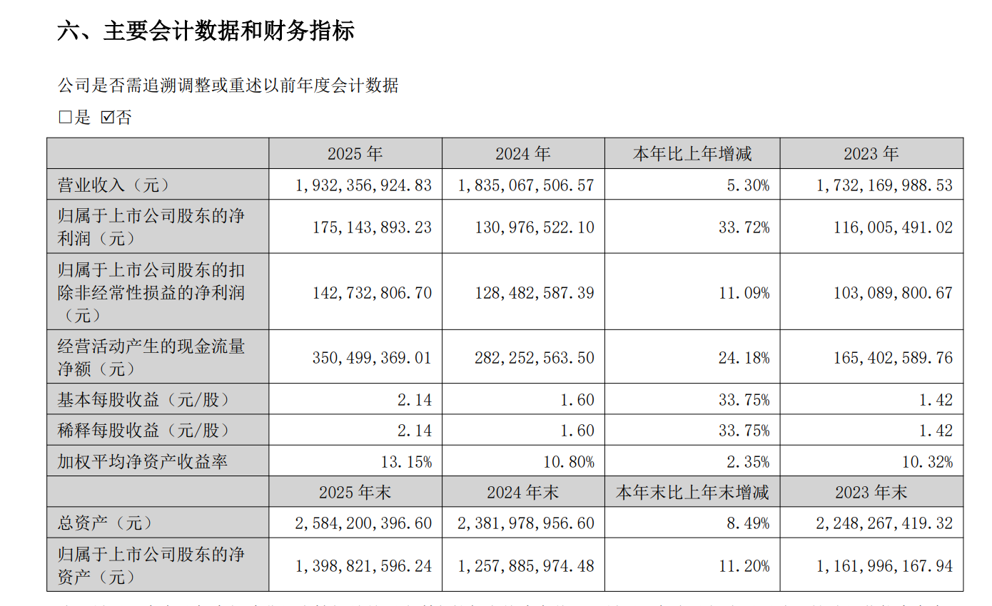 据年报显示,公司2025年经营活动产生的现金流量净额达3.50亿元,同比增长24.18%。截至报告期末,公司总资产为25.84亿元,较上年末增长8.5%;归母净资产为13.99亿元,较上年末增长11.2%。