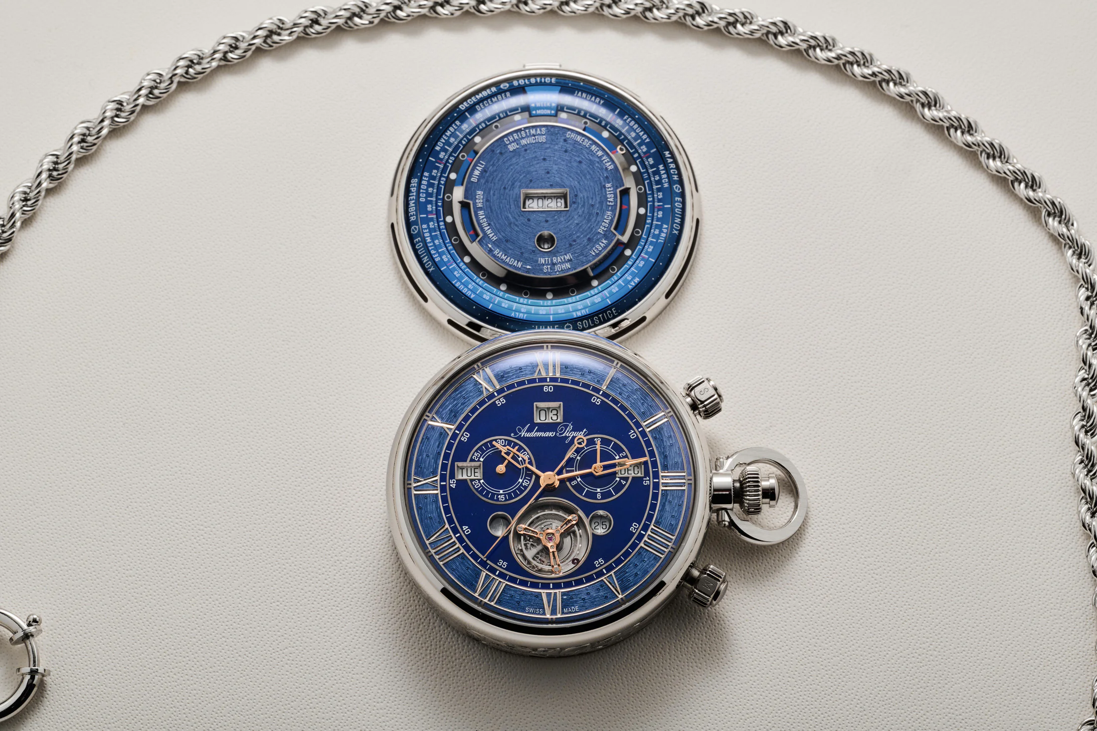 根据爱彼品牌方面透露,这块怀表的灵感来自品牌总裁Ilaria Resta和爱彼制表设计总监、传奇制表大师Giulio Papi在2023年末的一场对话。Giulio Papi及团队最后花了20个月打造了这款怀表。