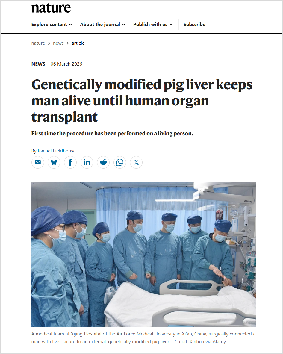 近日,国际顶级学术期刊Nature(《自然》)官网发表大学西京医院肝胆外科窦科峰院士团队领衔的一项,全球首创临床研究的新闻报道。该团队于今年2月成功为一名56岁肝衰竭患者实施基因编辑猪肝脏体外灌注治疗,这是国际上首次将该技术应用于活体患者。患者在借助灌注系统维持生命数日后,成功接受了同种肝移植,目前恢复良好。