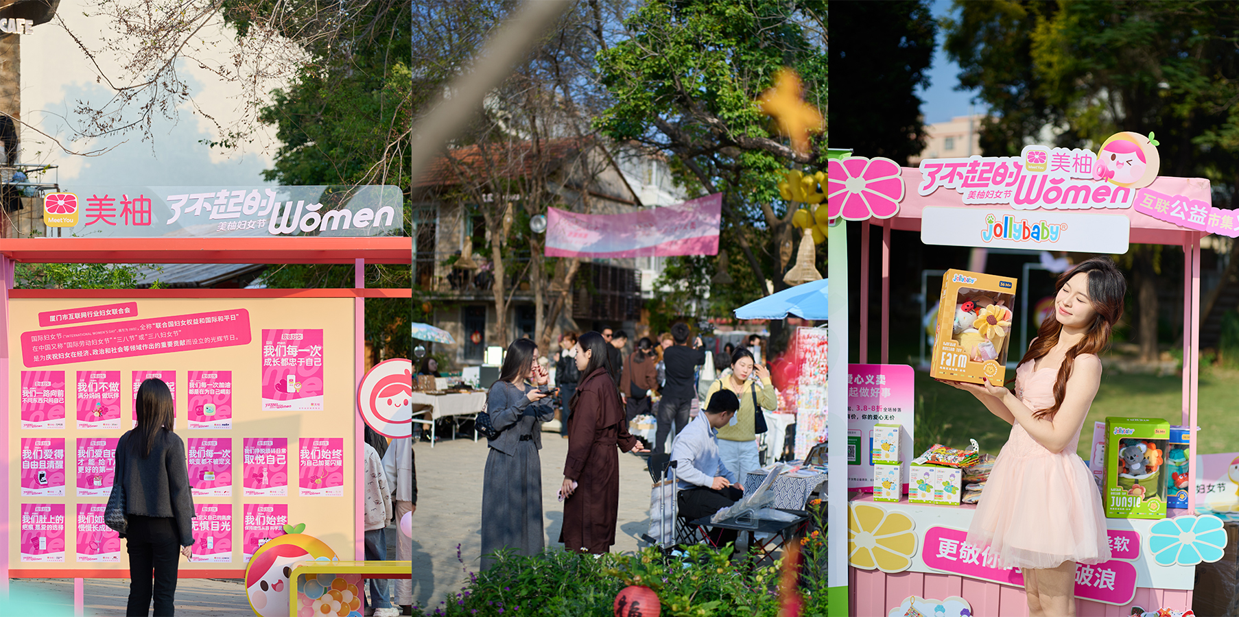 今年,美柚的声量不止于线上。妇女节期间美柚在厦门新晋文艺地标——不问东西艺术街区搭建起一座 “女性友好空间”。我们与街区共创“女性友好商店”,让商店的每个角落、每扇橱窗,都开始讲述“了不起”的故事。