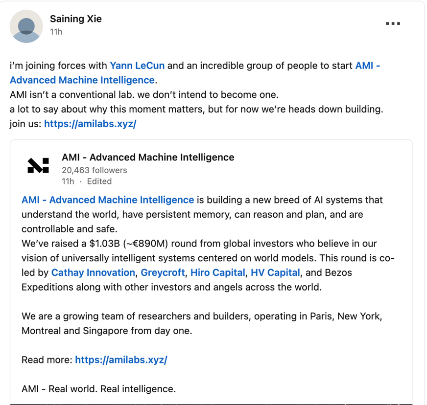 2025年12月,杨立昆正式官宣创立Advanced Machine Intelligence Labs(简称AMI Labs)——名字和法语里的“ami”(朋友)相近。2026年1月,AMI Labs在巴黎正式启动,自成立之初就定下了全球化布局,在巴黎、纽约、蒙特利尔和新加坡均设有办公室。
