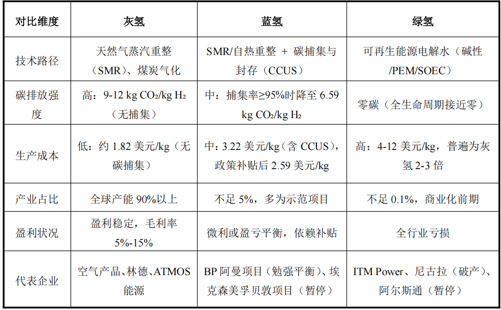 “灰氢稳、蓝氢弱、绿氢亏”:灰氢凭借成熟技术与成本优势(约1.82美元/kg)占据全球90%以上份额,是行业唯一稳定现金流来源;蓝氢因CCUS推高成本30%-50%,陷入“减碳不经济”的尴尬境地,仅少数项目微利;绿氢虽为零碳终极方向,但生产成本高达4-12美元/kg(灰氢2-3倍),全行业普遍亏损。