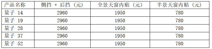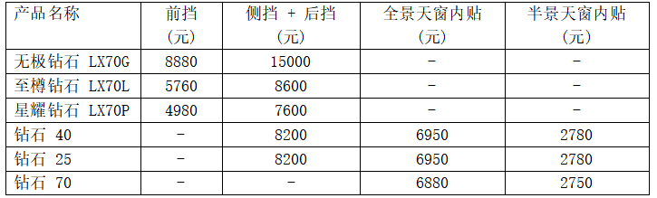 从价格体系来看,钻石系列在天窗贴膜方面提供了更加细化的选择,满足消费者对天窗隔热、防晒的个性化需求。