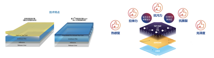 ·采用脂肪族TPU基材和自研涂层,提供出色防护、划痕自修复和抗黄变能力。