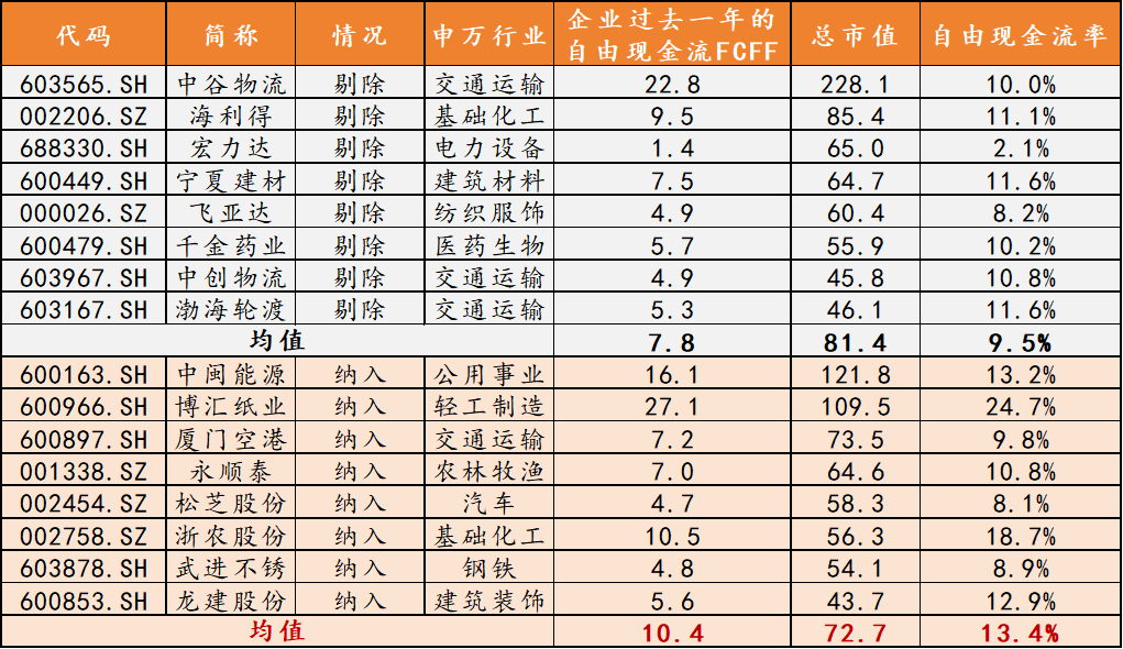 对比剔除和纳入的个股,发现指数能自动实现“高抛低吸”,前期涨幅较大、占比超过10%的个券或自由现金流率较低的将被调低权重或剔除,纳入造血能力更强、更有潜力的成份股!