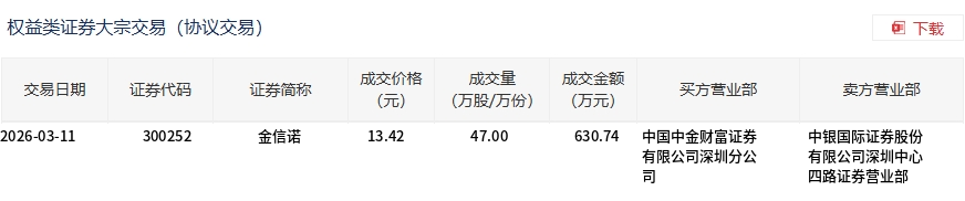 3月11日,金信诺大宗交易成交47万股,成交额630.74万元,占当日总成交额的0.74%,成交价13.42元,较市场收盘价15.1元折价11.13%。