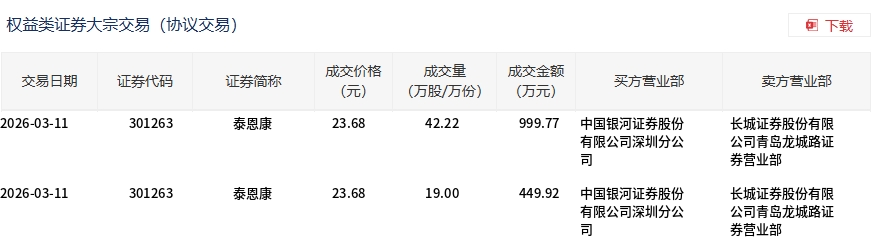 3月11日,泰恩康大宗交易成交61.22万股,成交额1449.69万元,占当日总成交额的22.02%,成交价23.68元,较市场收盘价29.4元折价19.46%。