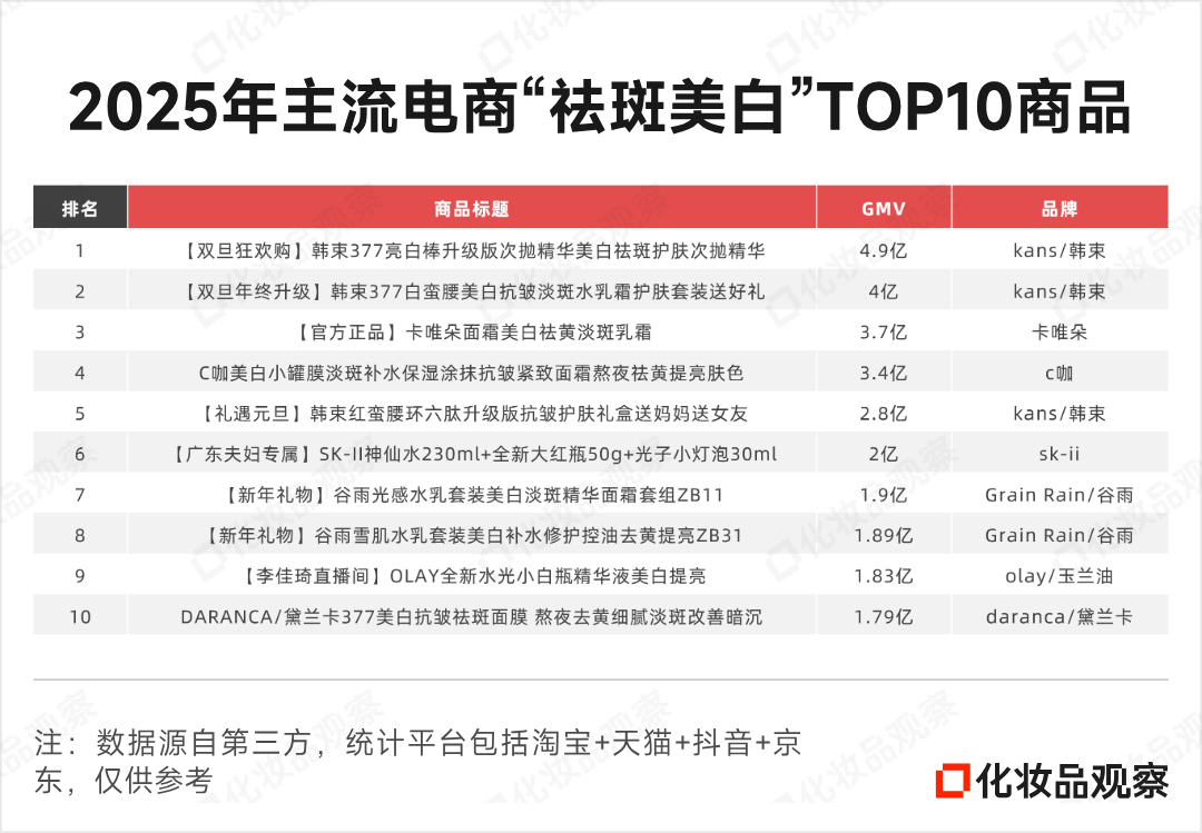 另一边是销售端逆势“狂奔”——2025年主流电商平台(淘宝+天猫+抖音+京东)上祛斑美白类产品总销售额达325亿元,同比增长48.7%。